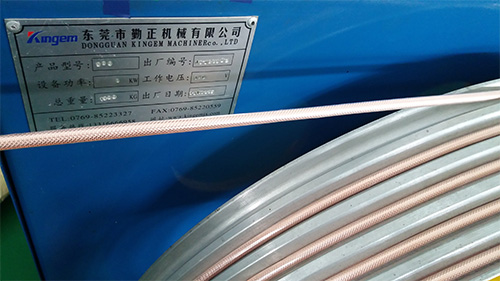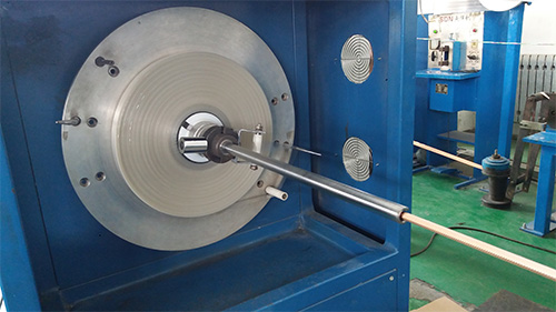 主要用于铁路信号电缆紫铜带(0.07-0.09毫米厚度,宽约30毫米)压点状纹或横纹,经过特殊模具将铜带纵向渐变成型,将线缆完全包覆,包覆好的芯线经过两台绕包头,进行同心式包带,使成型好的线缆在成缆或挤出时不炸开,包带材质如铝箔、棉纸、聚酯带、耐火云母带等;